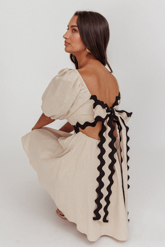 Tiki Boxy Sleeve Print A-line Midi Dress Beige