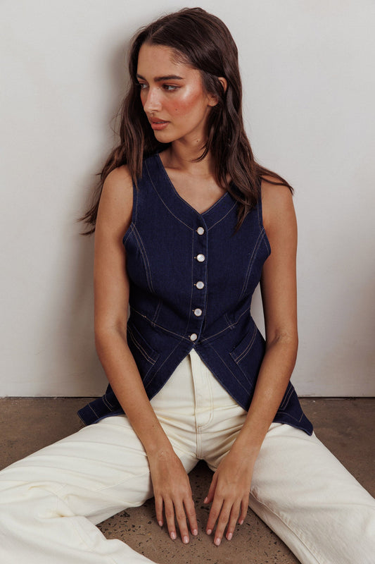 Philomena Button Front Pocket Vest Top Denim