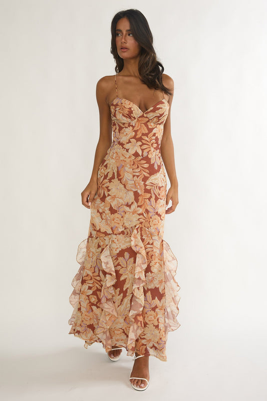 In Blooms Mesh Bodice Maxi Dress Print Chocolate