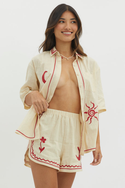 On Vacay Elastic Waist Shorts Embroidered Beige