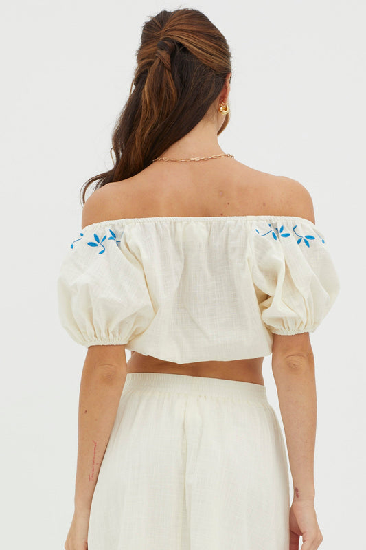 Ritual Puff Sleeve Embroidered Crop Top Beige