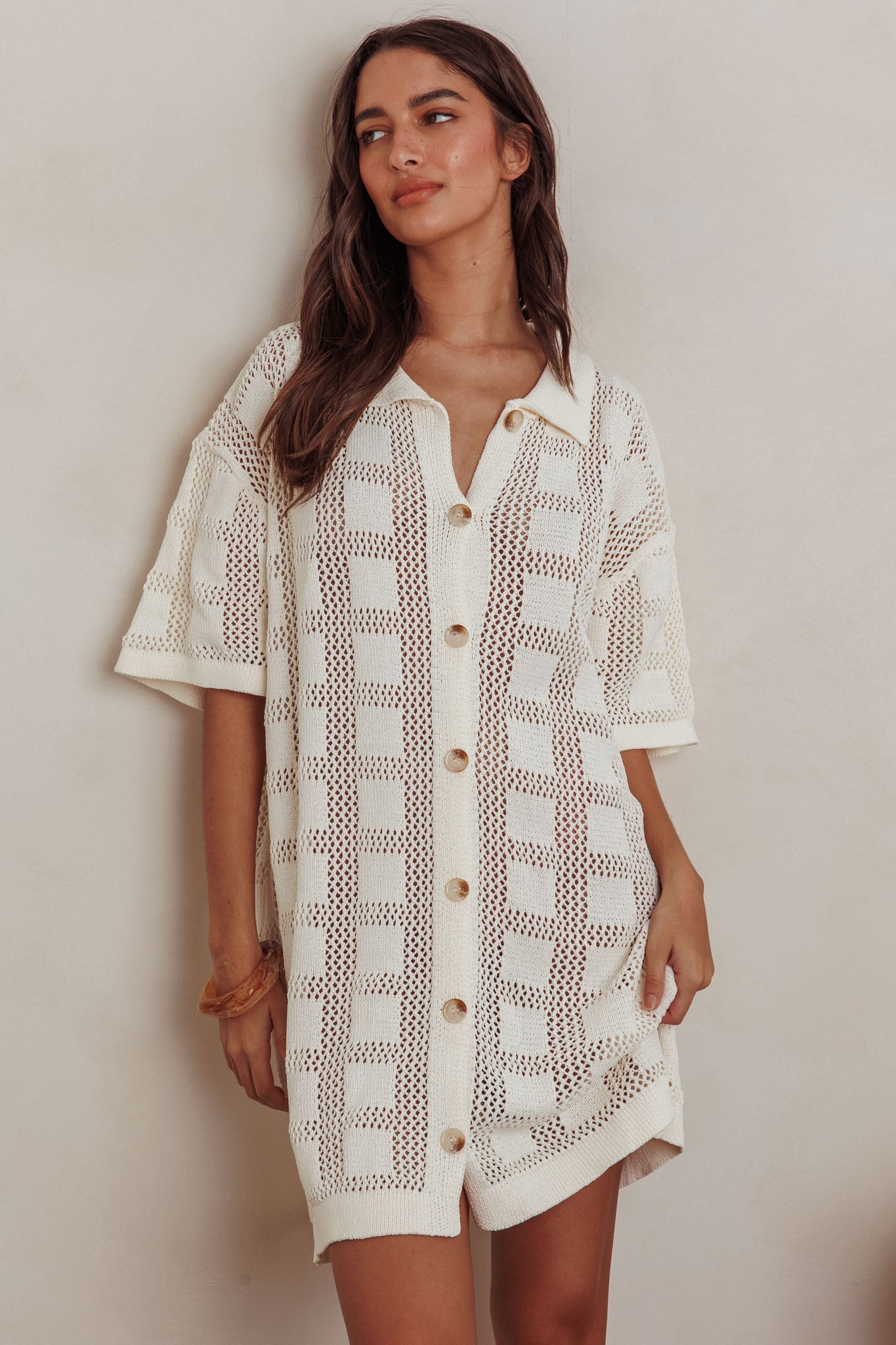 Best Friend Knit Shirt Dress Beige