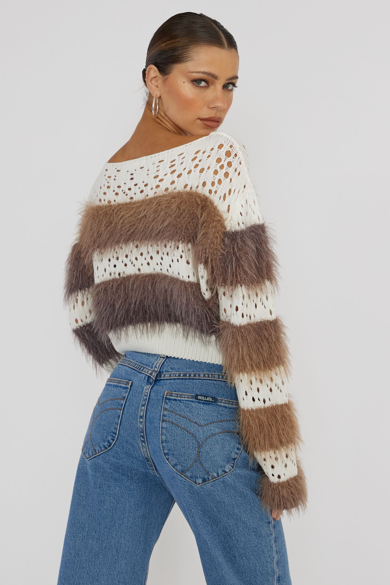 Strut through your weekend in our super cool Borealis sweater. We are in love with its fur stripe detail and is perfect for a movie date with your crush! Pair it with your fave mom jeans and sneakers for a cute look we are loving.