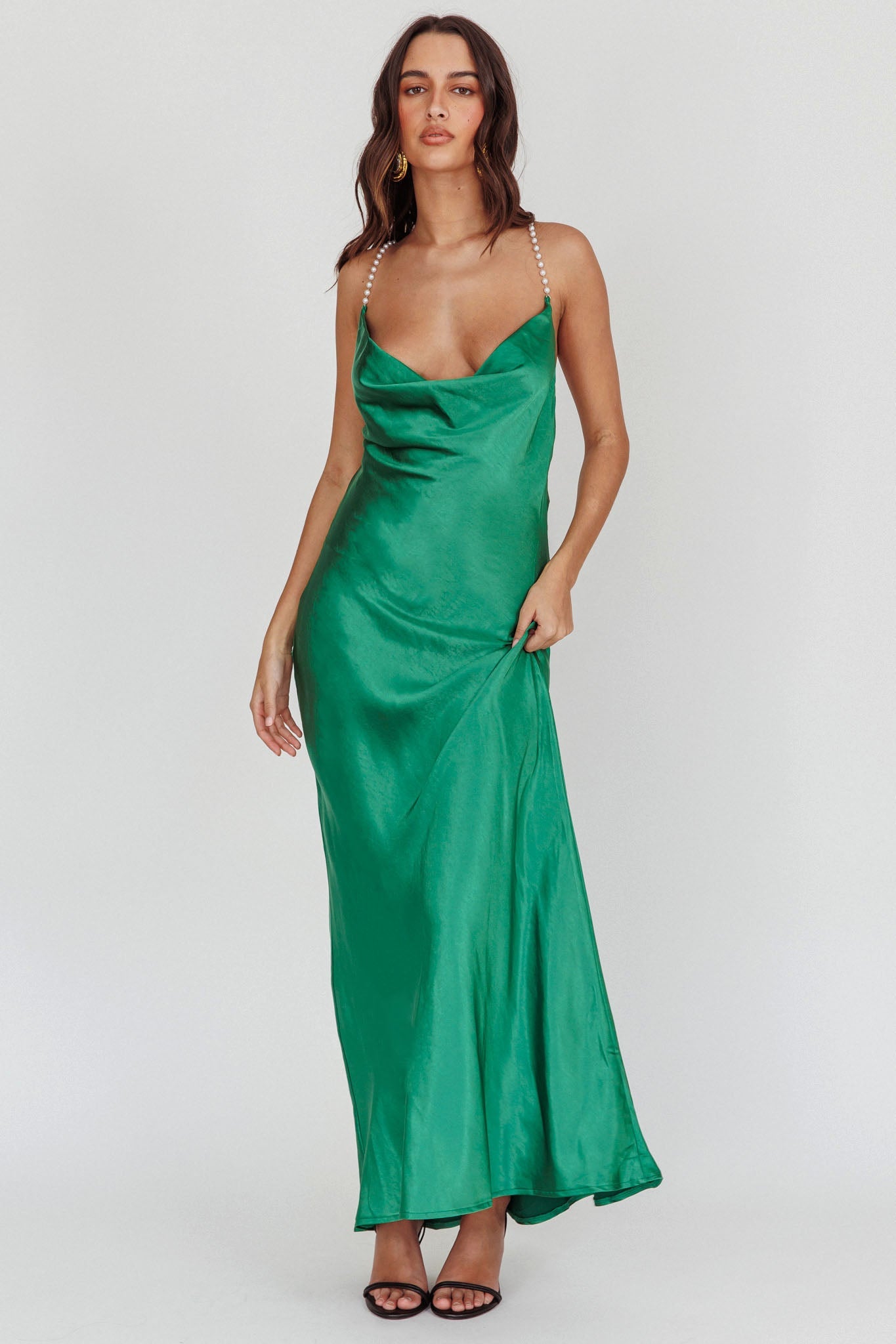 Danijela Cowl Neck Pearl Satin Maxi Dress Emerald