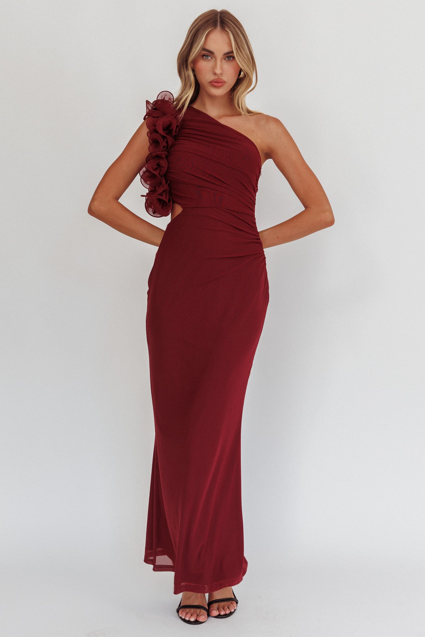 Deanna One-Shoulder Ruffle Maxi Dress Wine