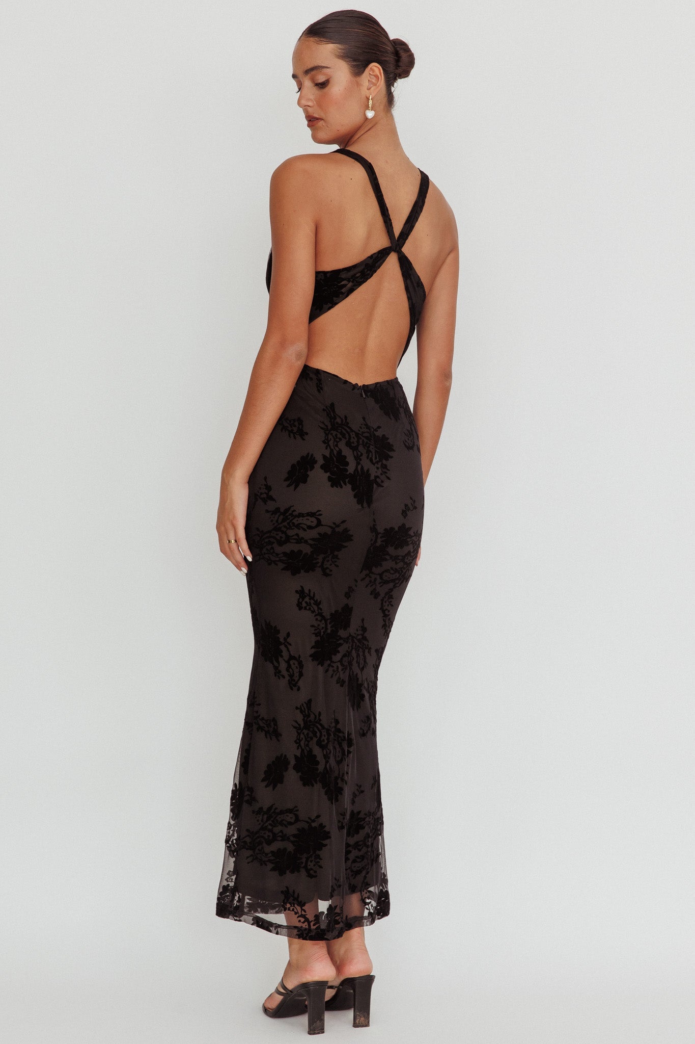 Elevate your evening wear with our Delancy maxi dress. It boasts a captivating velvet floral texture and flattering cowl neck. The opened back adds a touch of allure. Whether you're attending a gala or going on a romantic date, this dress is your ticket to effortless glamour.