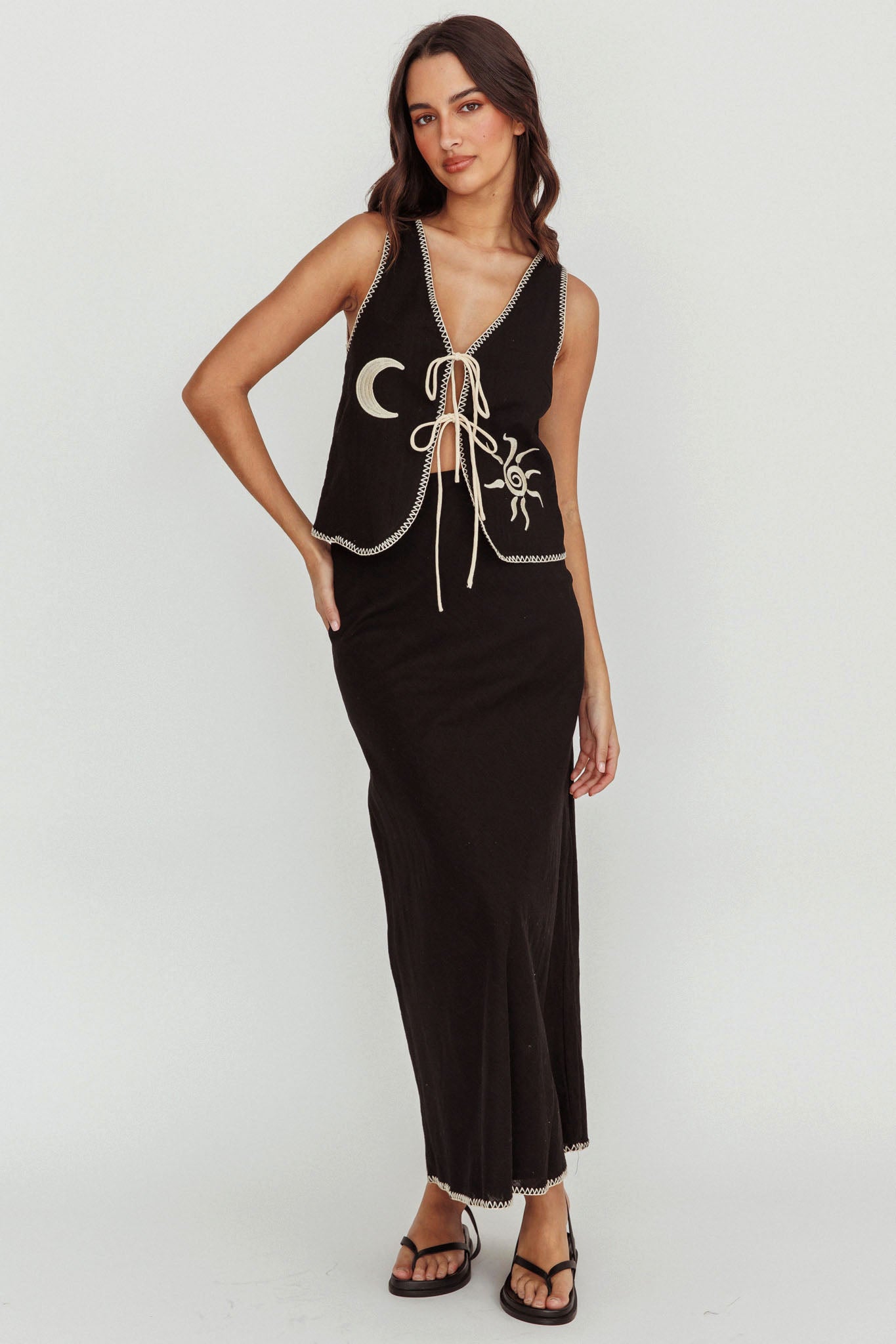 Float through your day in our pretty Dose Of Sunshine maxi skirt. We are in love with its pretty contrast blanket stitch hem! It's perfect for weekend coffee dates with your besties. Team it with its matching vest top and sandals for a super cute look that'll have everyone asking, "Where'd you get your outfit?!"