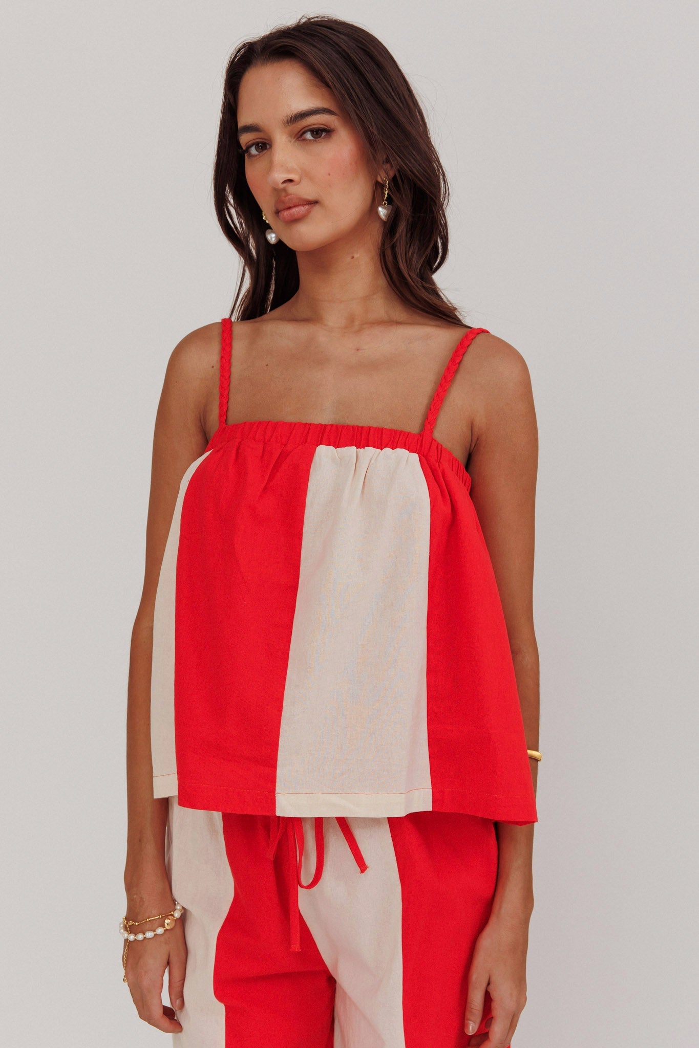Introducing our chic Dream Girl top. Featuring braided straps that add a touch of texture, this piece is designed to elevate your wardrobe effortlessly. The contrast paneling creates a striking visual impact, perfect for those who like to make a statement. Pair it with it's matching pant or mix and match for endless possibilities!