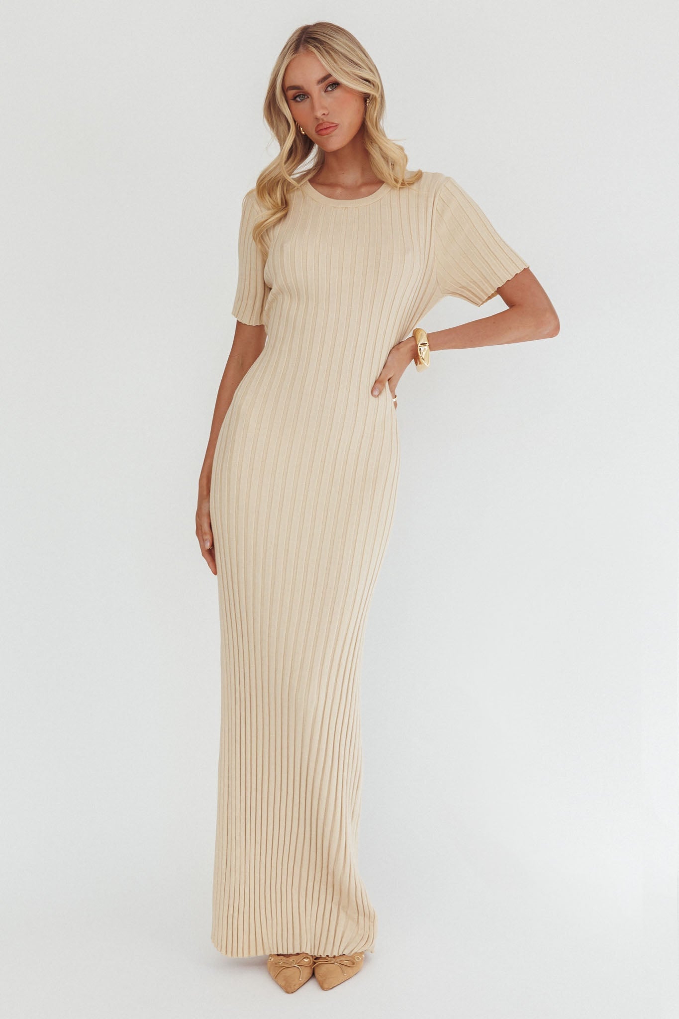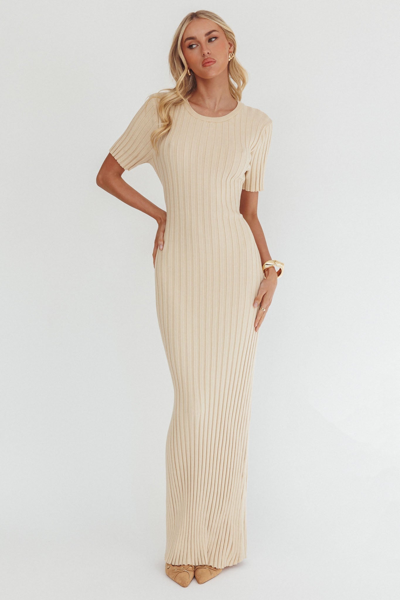 Faylen Waist Tie Ribbed Knit Maxi Dress Cream