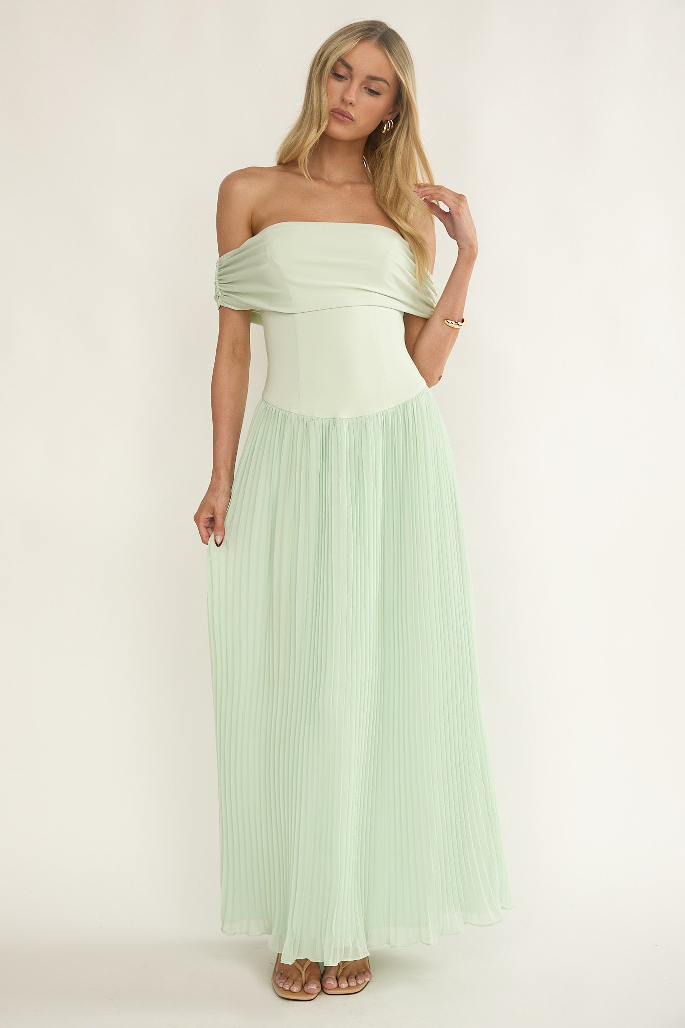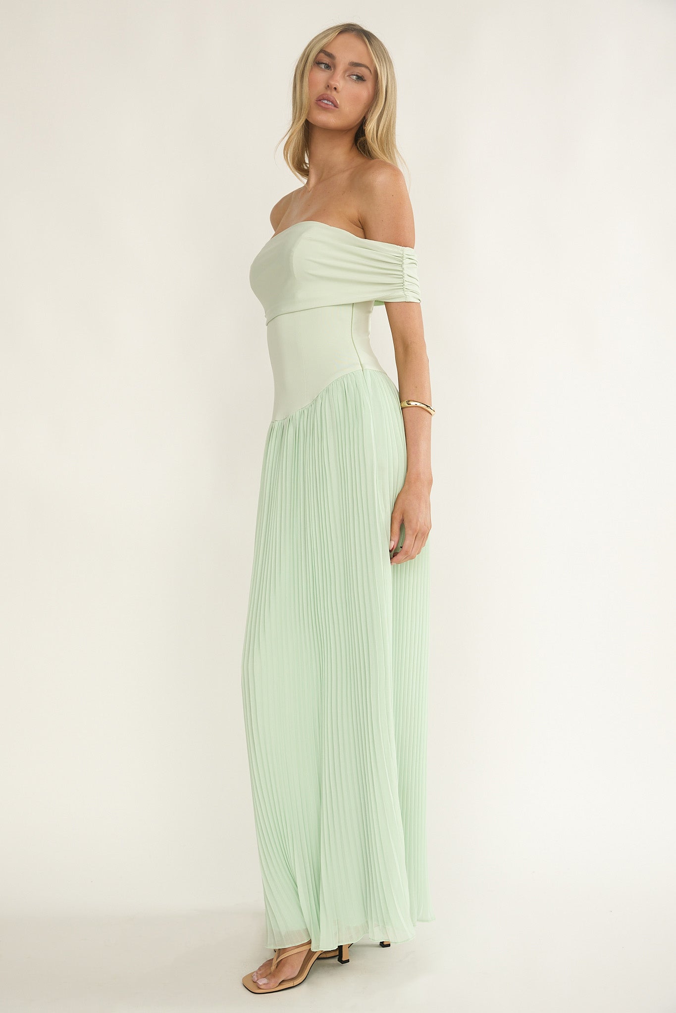 Flutters Off-Shoulder Accordion Pleat Dress Sage