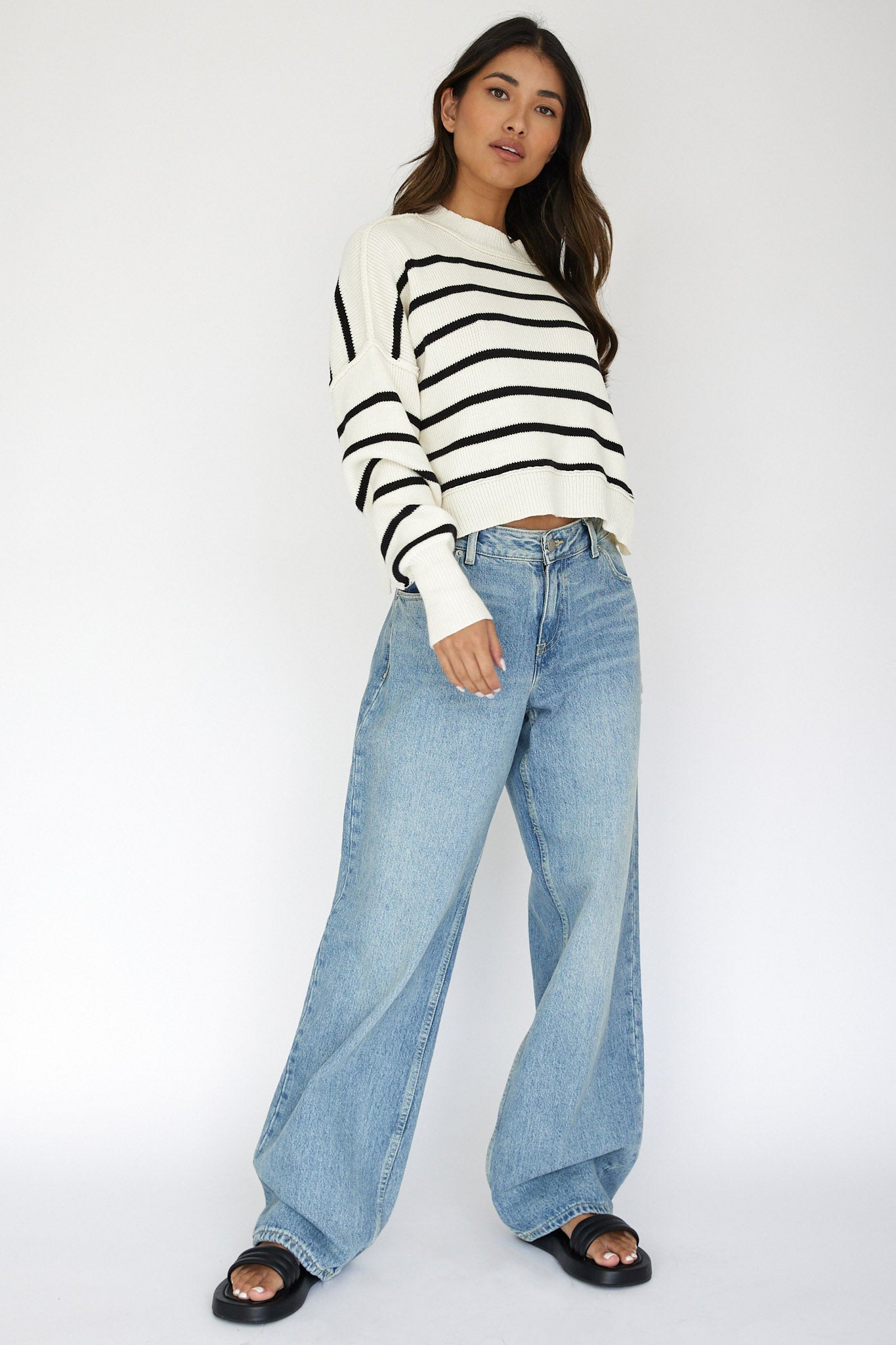 Hello, cutie! You will fall in love with our chic Fly High sweater. Featuring a classic stripe and loose fit, it's perfect for weekend coffee dates with your besties. Pair it with your fave wide-leg jeans and slides for an effortless, on-trend look.
