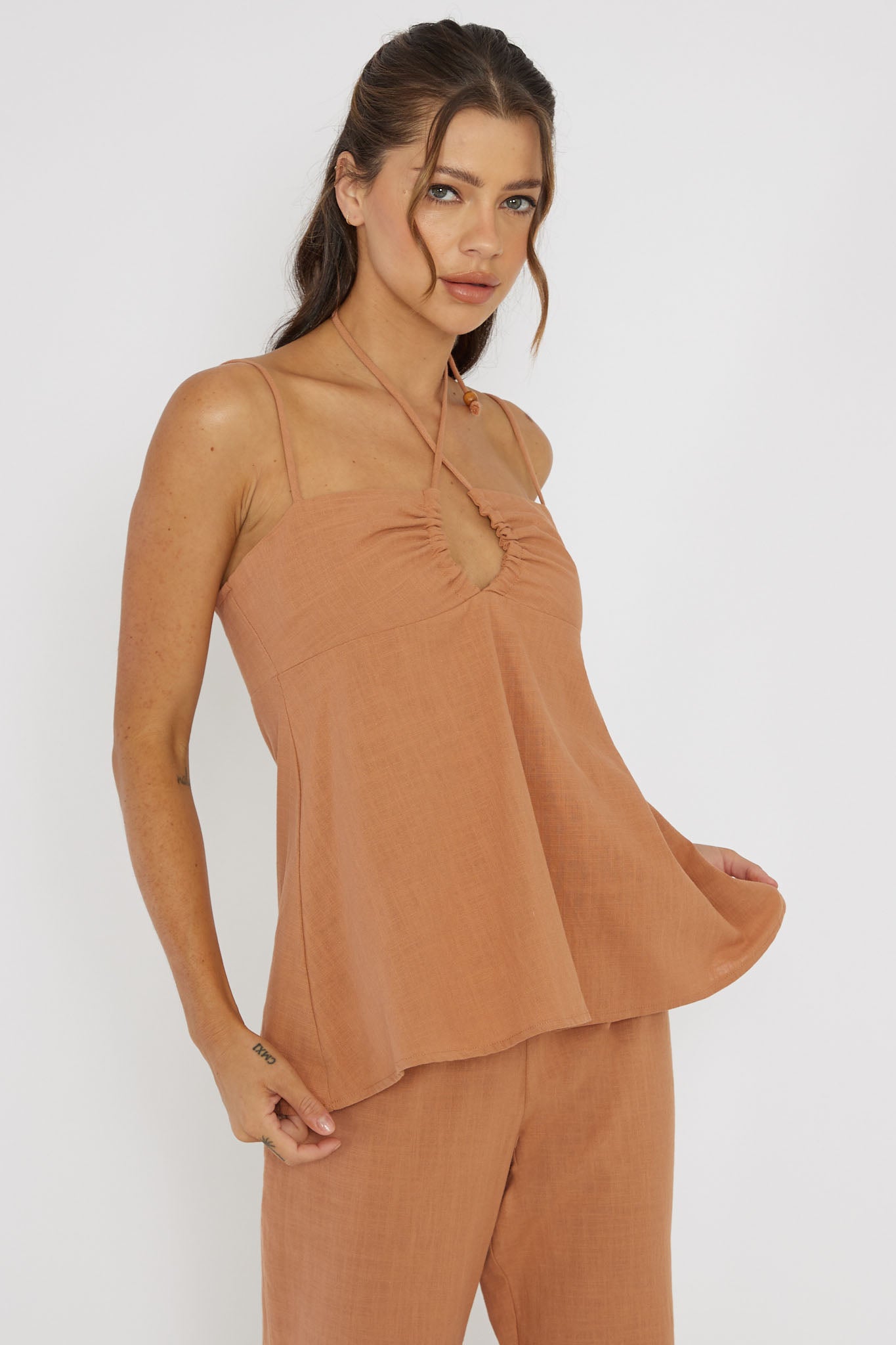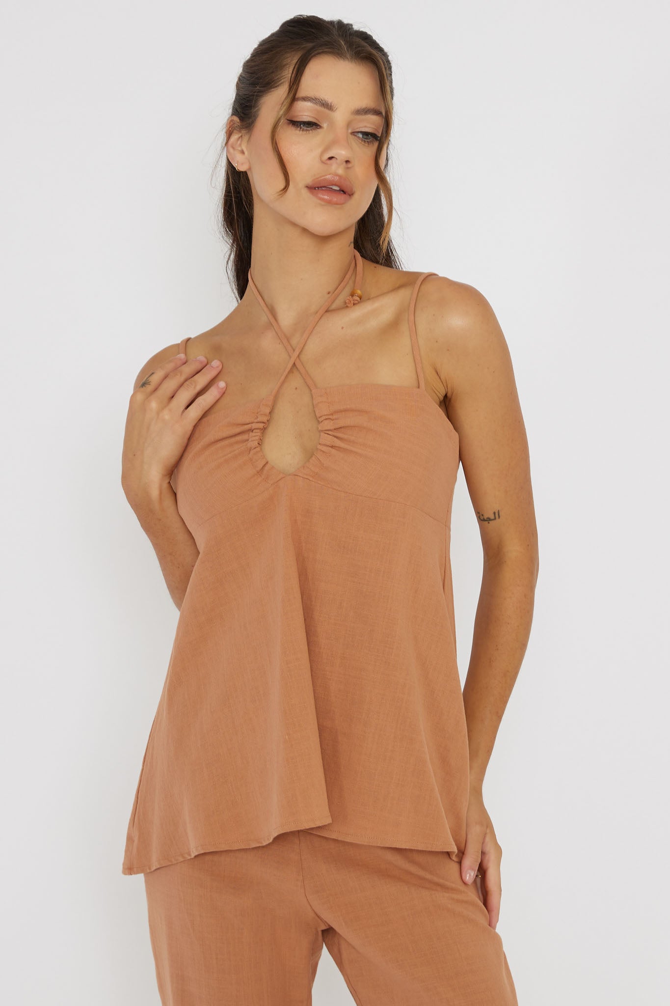 Cruise through your Saturday in our chic Freestyle top. We are in love with the breezy, light fabric and cute tie detail in the bust. It's perfect for coffee dates or your nine-to-five. Team it with its matching pants and sandals for an It Girl look.