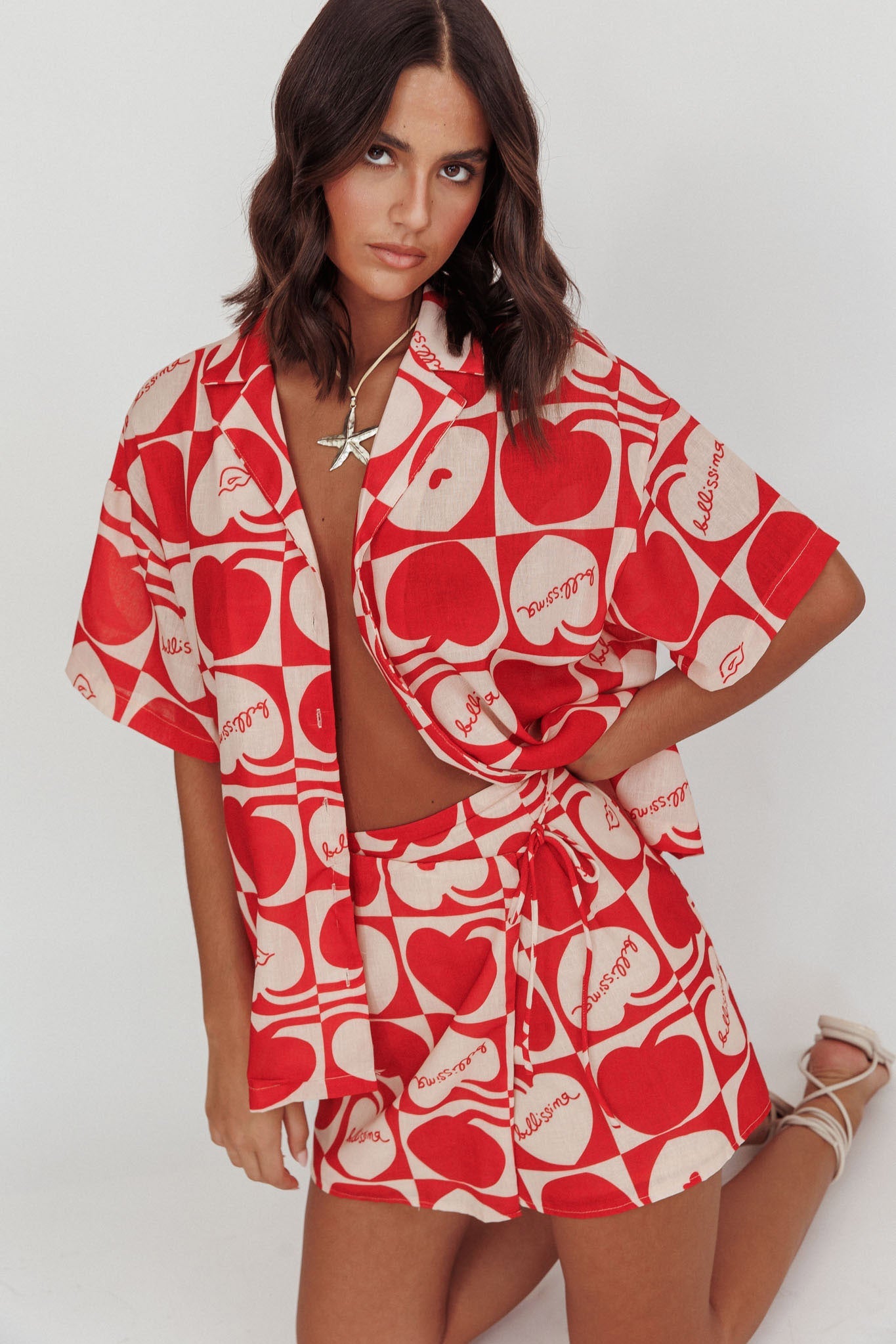 Embody the essence of summer with our Ithaca mini wrap skirt! Featuring a playful side tie and cherry print, this skirt is sure to add a touch of paradise to your fits. Pair it with our matching top for an effortlessly coordinated look or mix and match for endless combination.
