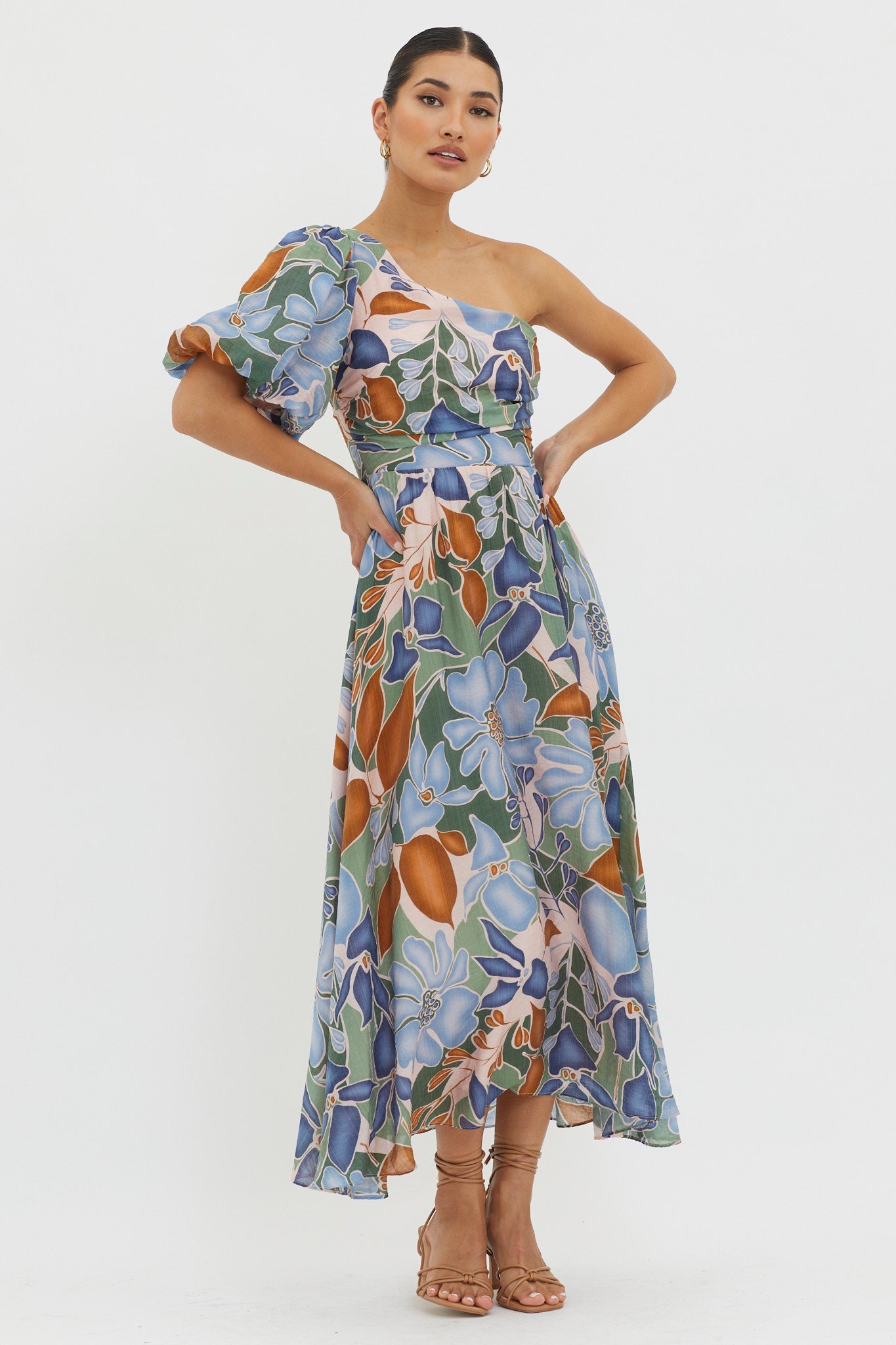 Turn heads in our pretty Jayni midi dress. Featuring a one-shoulder design and puffed sleeve, it's perfect for Sunday brunch with your girls. Team it with tan mules and a tote for an unforgettable look.