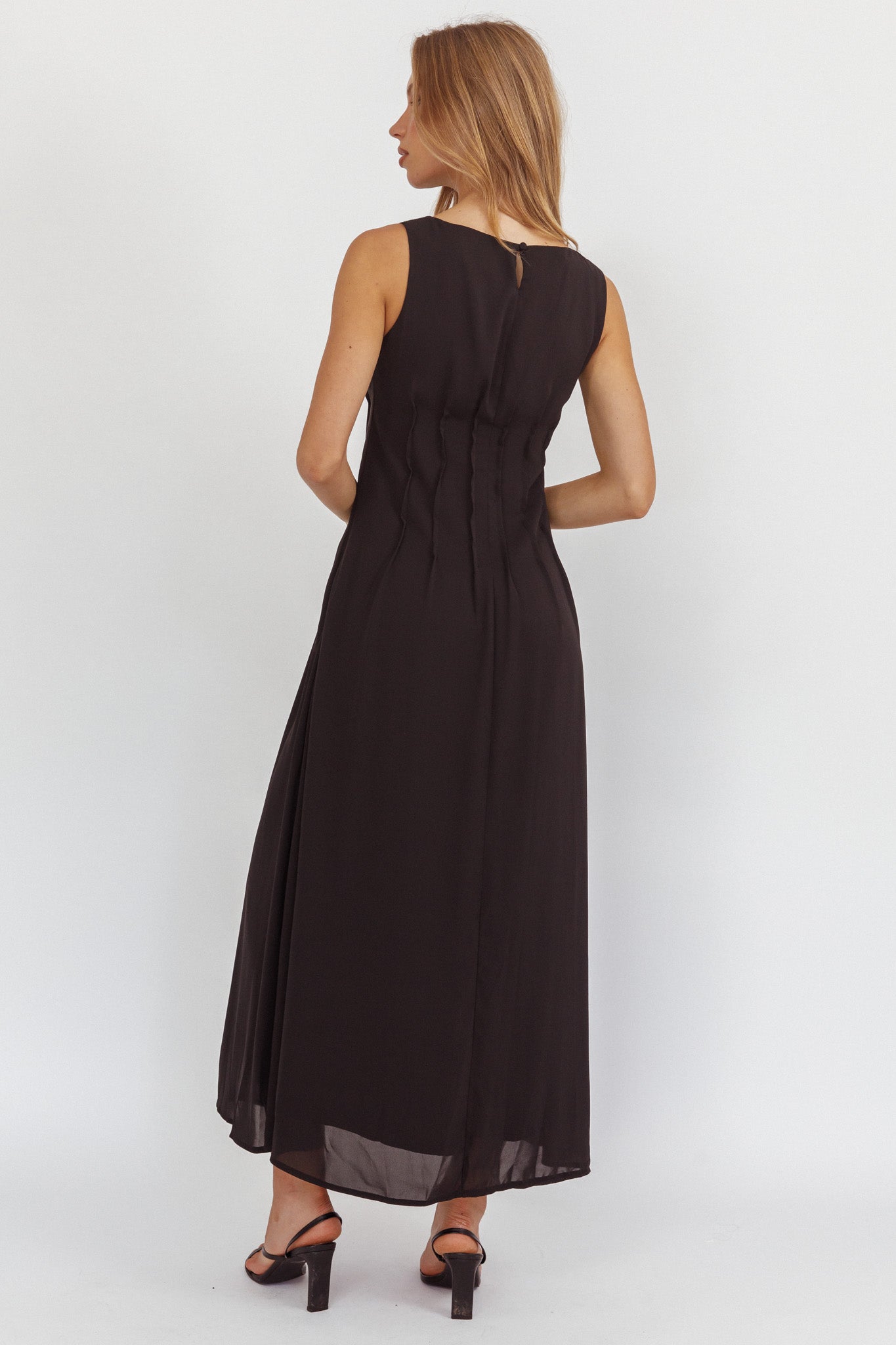 You will look super chic in our Karine maxi dress. It features a sleeveless design with pintuck pleat detailing. It's perfect for weekend coffee dates with your girlies teamed with sandals and a tote for a look that will turn heads.