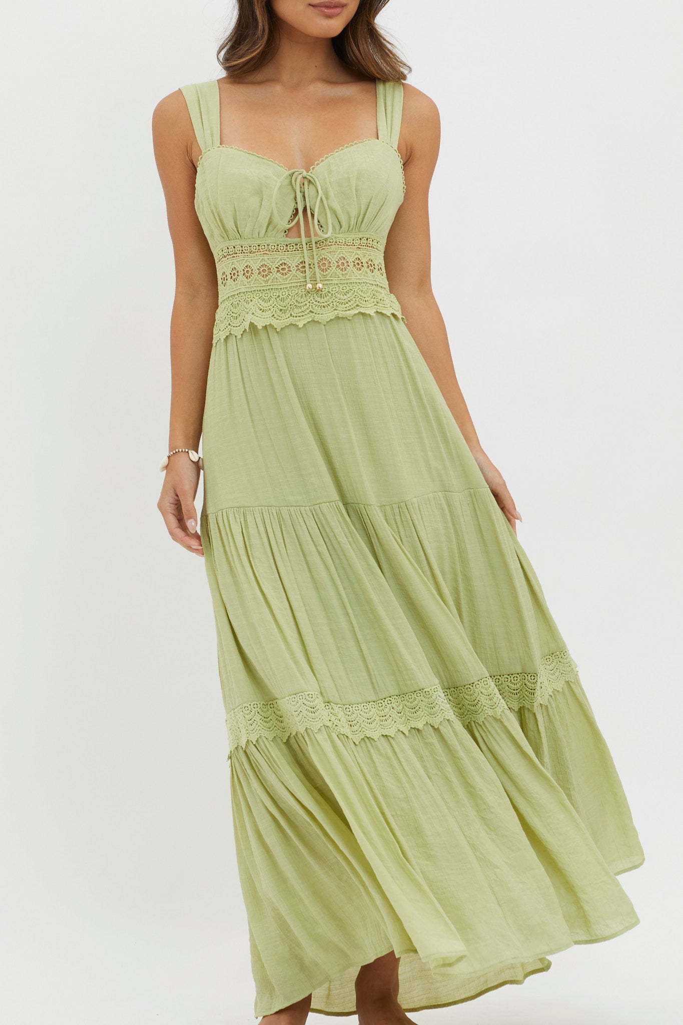 Float through your day in our pretty Libby maxi dress. It features crochet lace detail in the waist and a tie in the bust. Perfect for lazy Sundays strolling your fave vintage markets. Team it with sandals and a straw tote for a chic look.