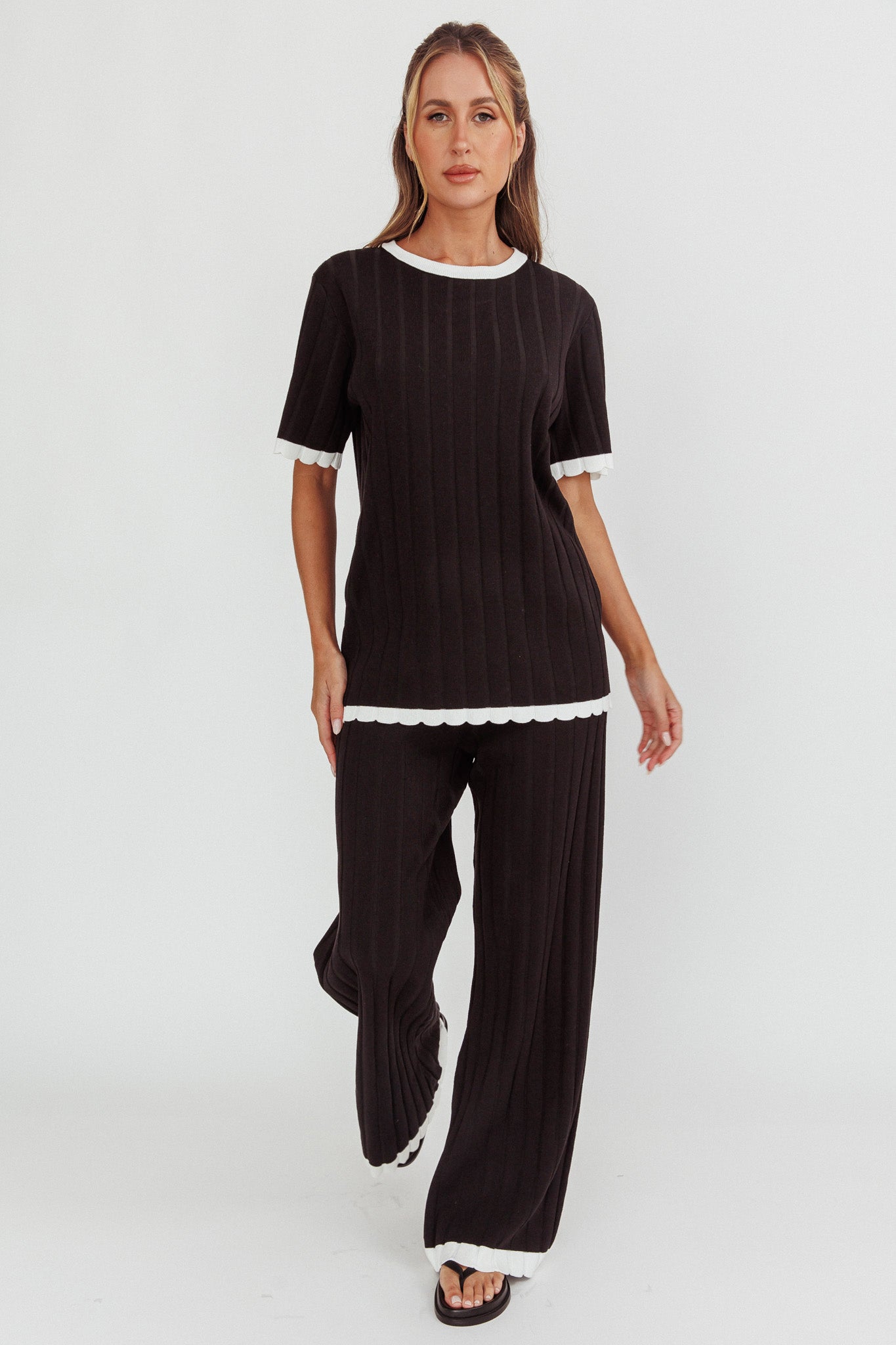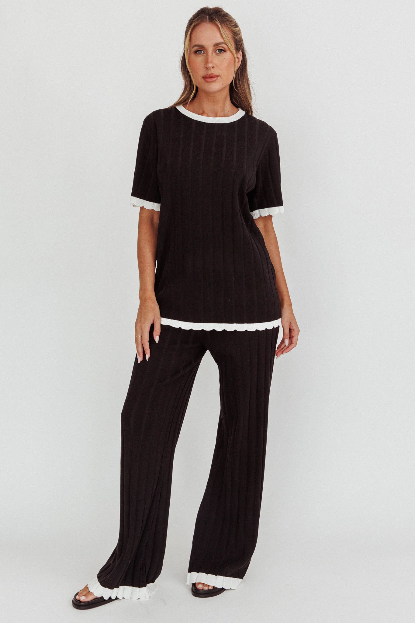 Liloh Contrast Trim Ribbed Knit Pants Black