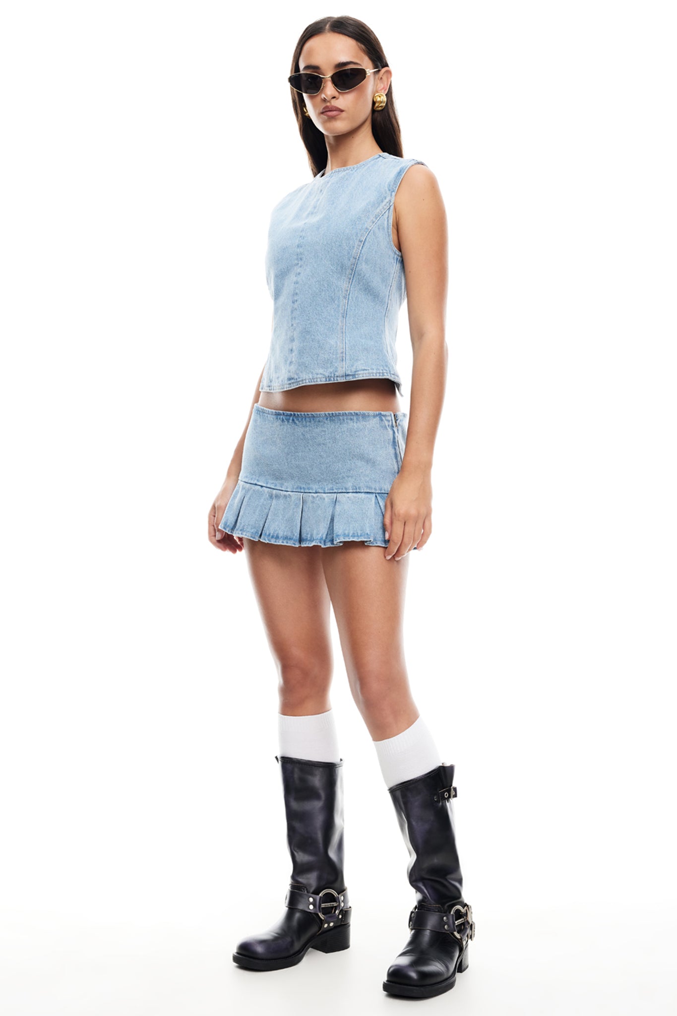 Channel your inner fashionista and make a statement in style with LIONESS' Miracle mini skirt. The pleated design adds texture and movement, while the denim fabric exudes effortless cool. Pair it with the matching Countryside Top or mix and match for endless possibilities!