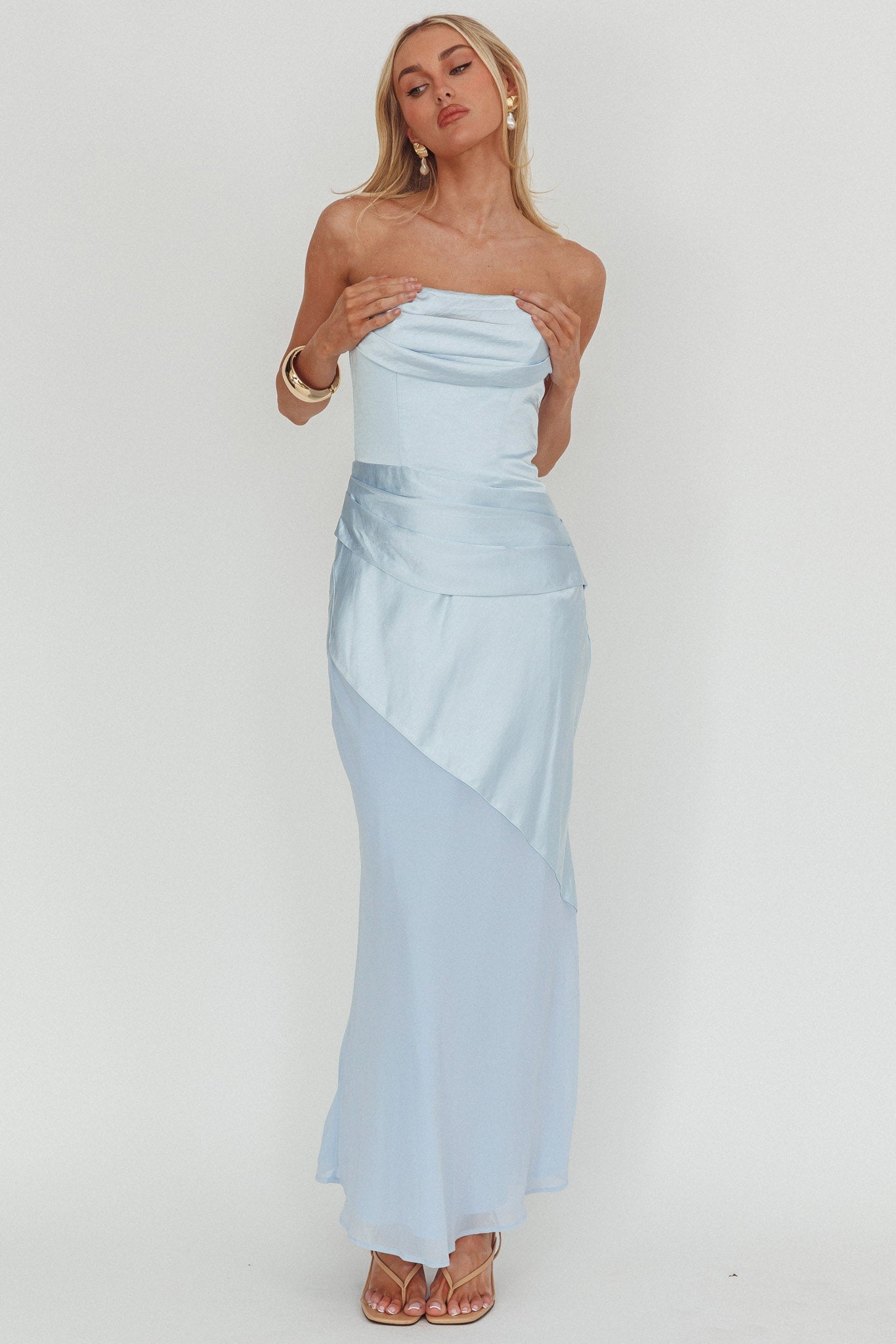 Moon Aura Pleat Detail Strapless Maxi Dress Blue