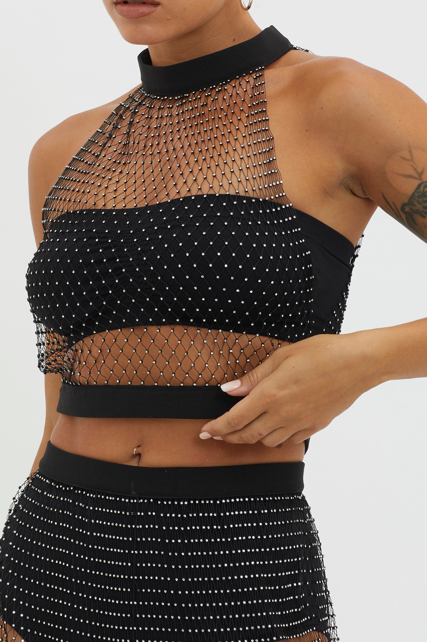 Make jaws drop in our gorgeous Moon Rock top. Featuring a diamante mesh fabric and halter style, this top will make a big statement. Perfect for a birthday celebration or glam night out with your girls. Team it with its matching pants and a baguette bag for a hot look.