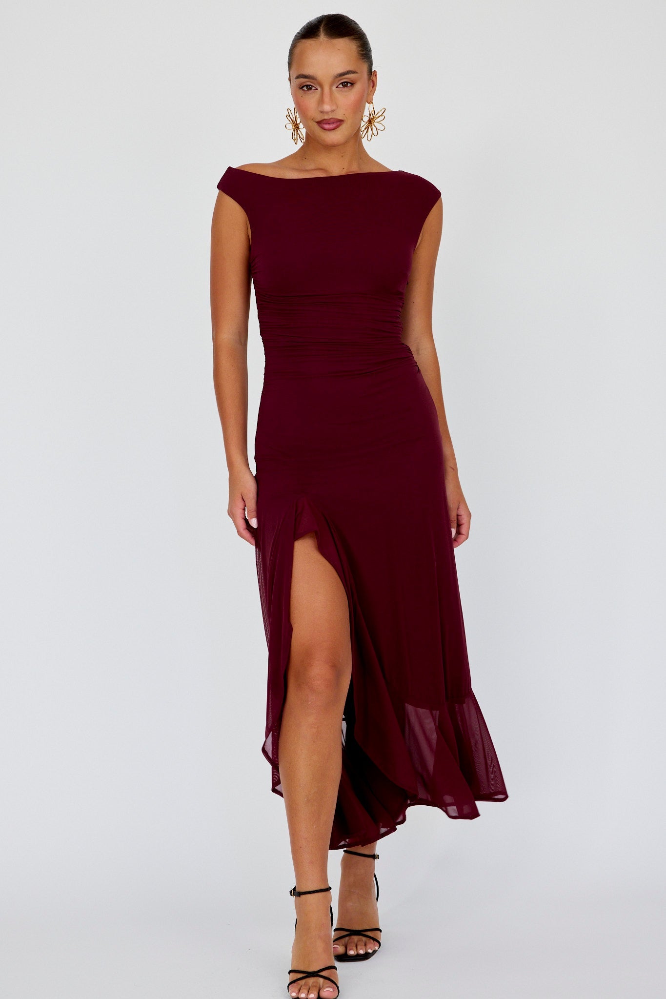 Moonlit Magic Asymmetric Neckline Maxi Dress Wine