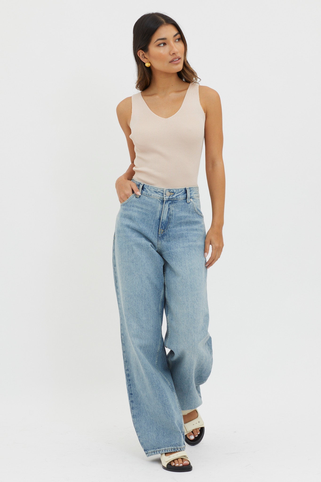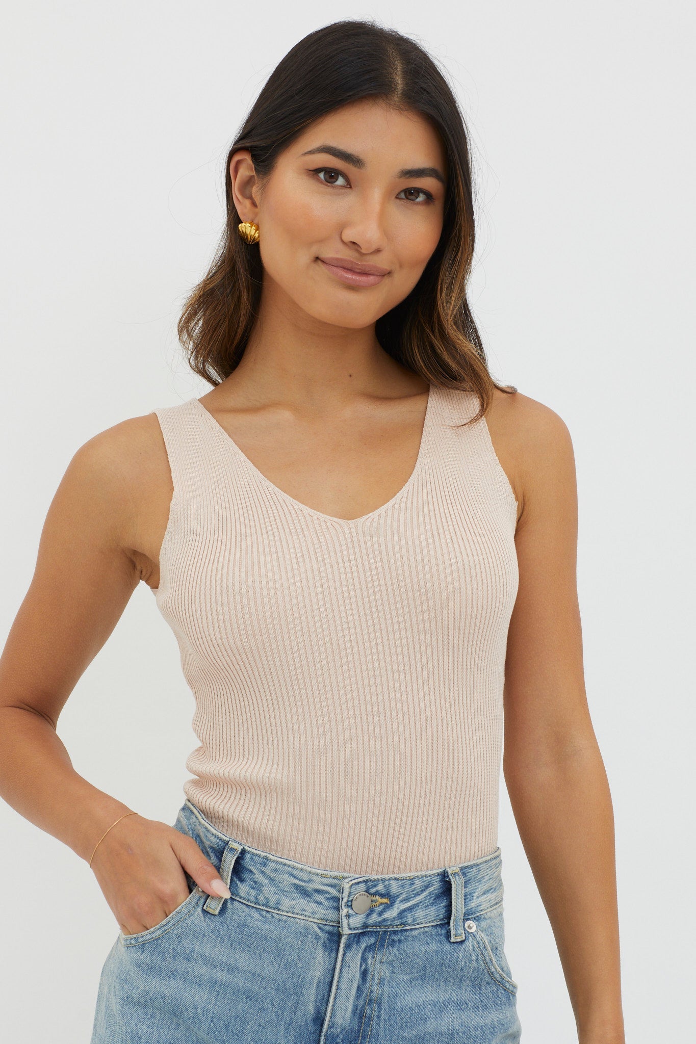 Off-Duty V-Neck Ribbed Knit Top Beige