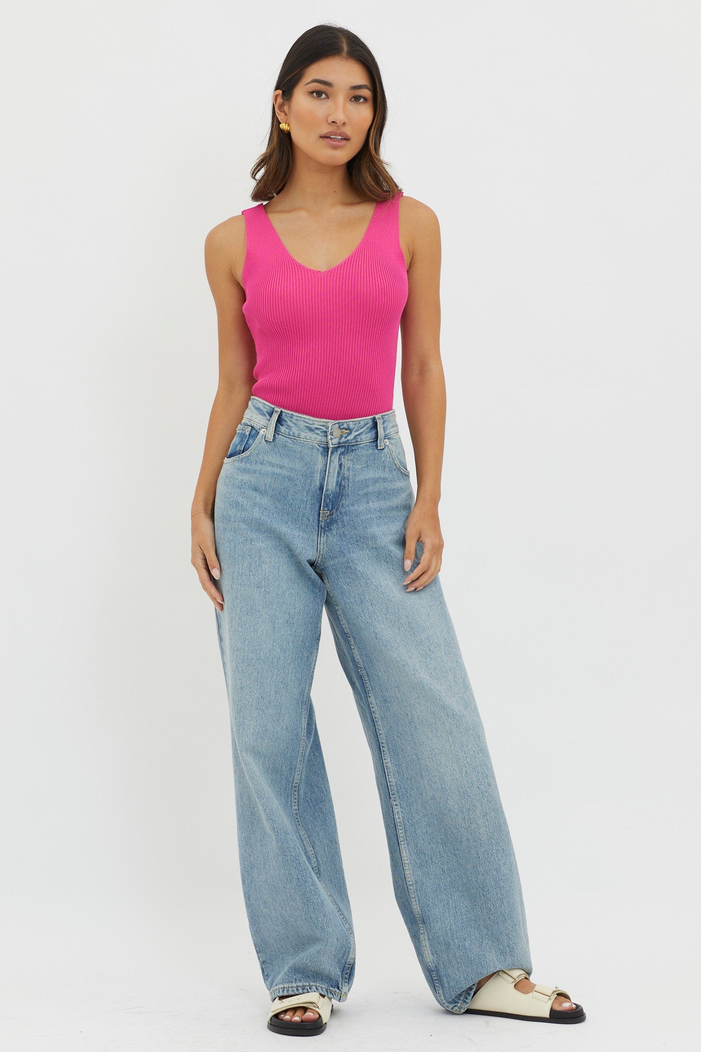 Off-Duty V-Neck Ribbed Knit Top Hot Pink