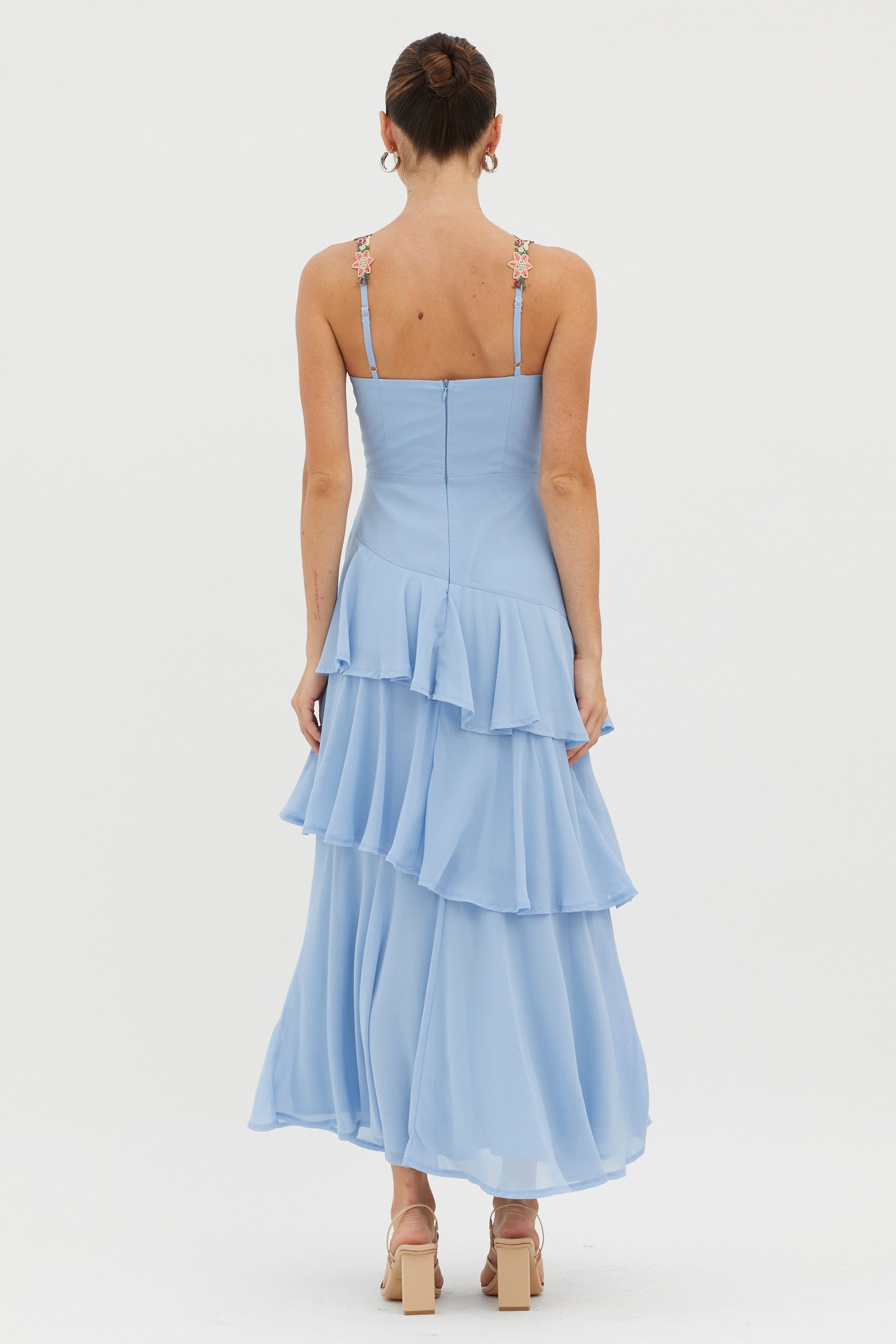Rose Garden Tiered Ruffle Floral Trim Dress Blue