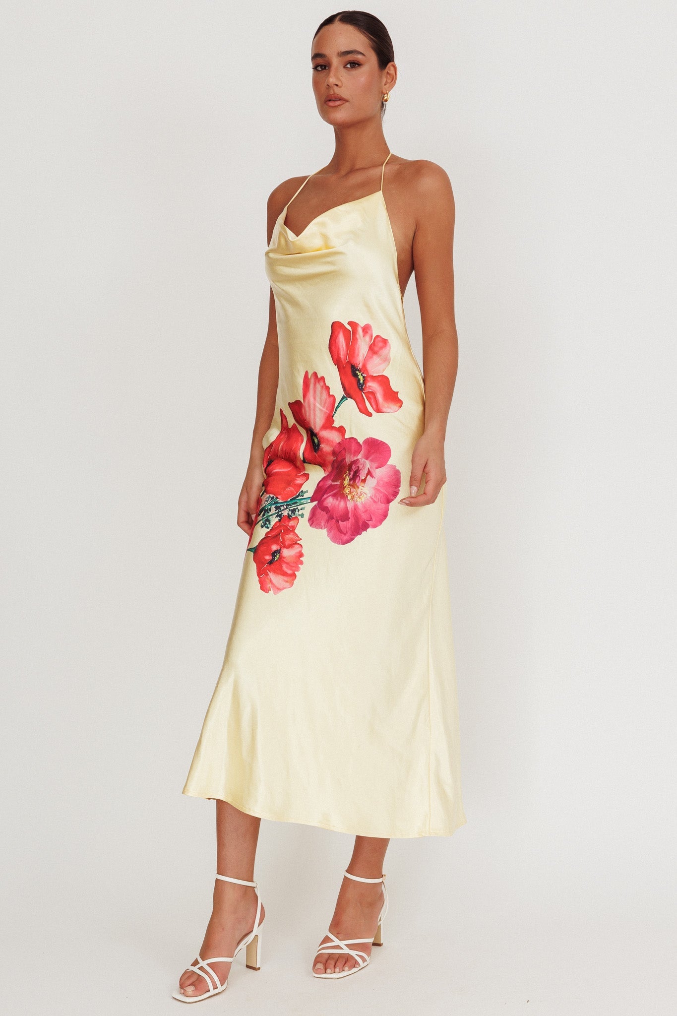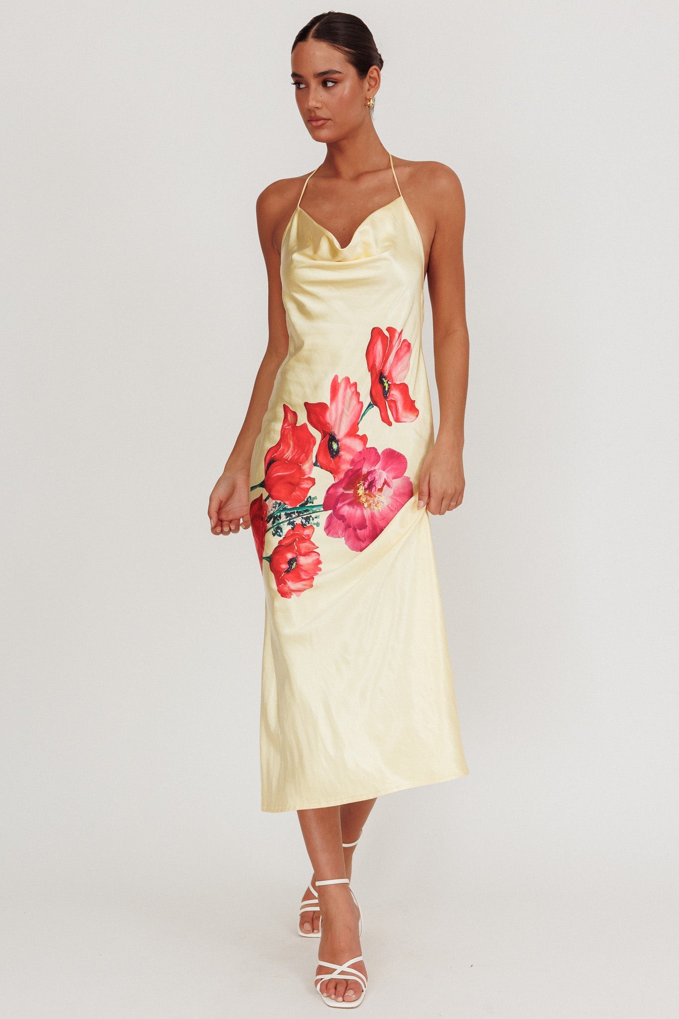 Be captivating in our Seren midi dress- where elegance meets party. Featuring a relaxed cowl halterneck, a flirtatious backless design and adorned with a delicate placement floral print. Perfect for any occasion where you want to feel bold and stylish, from dinner dates to evening gatherings. Accessorise with your go-to jewelry to take your look to the next level!