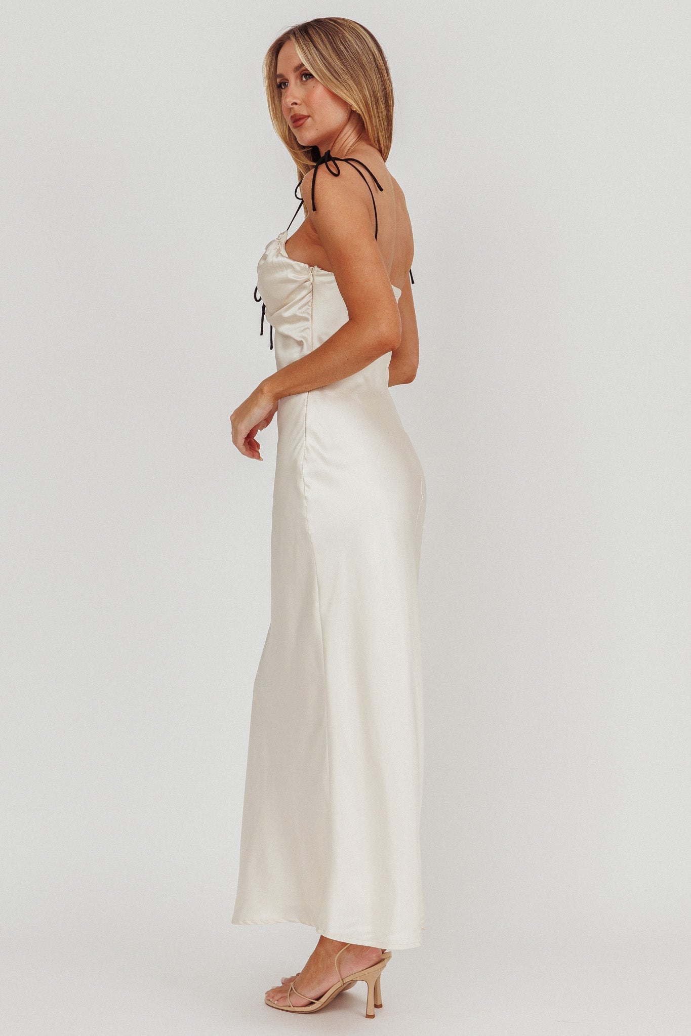 Slow Burn Tied Shoulders Satin Maxi Dress Oyster