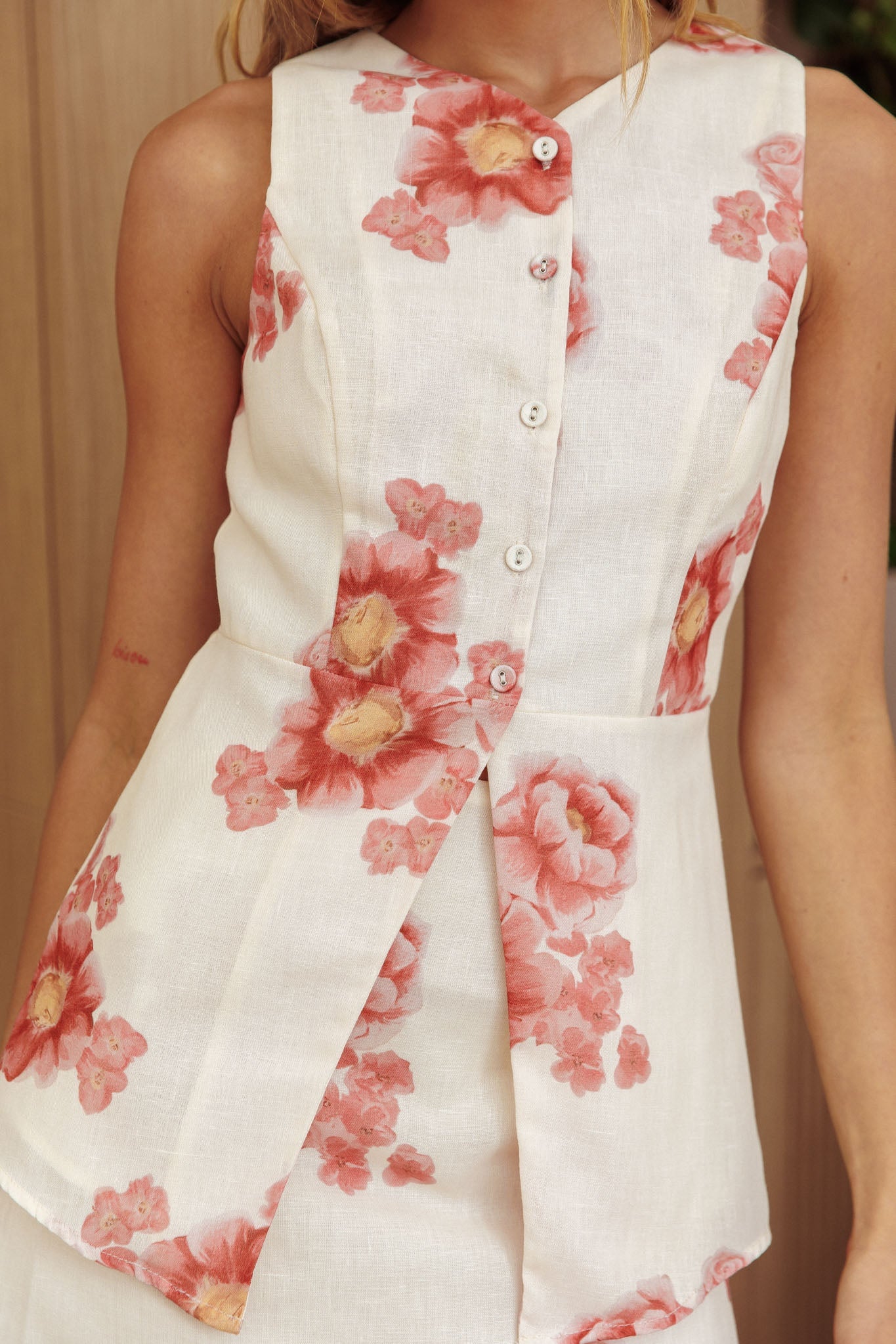 Sunlit Grove Button Front Top Floral Cream/Red