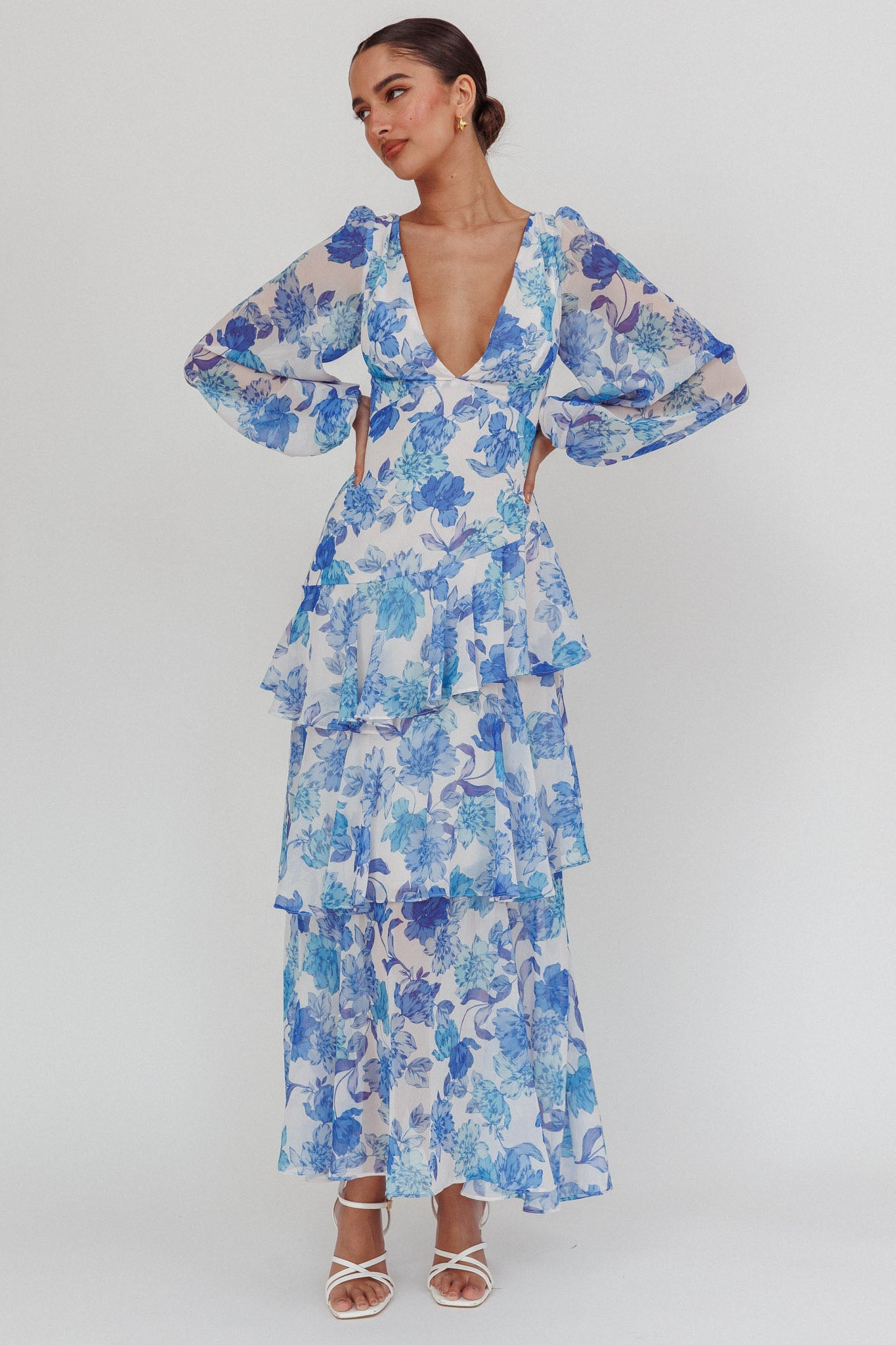 Veda Long Sleeve Floral Tiered Ruffle Maxi Dress Blue