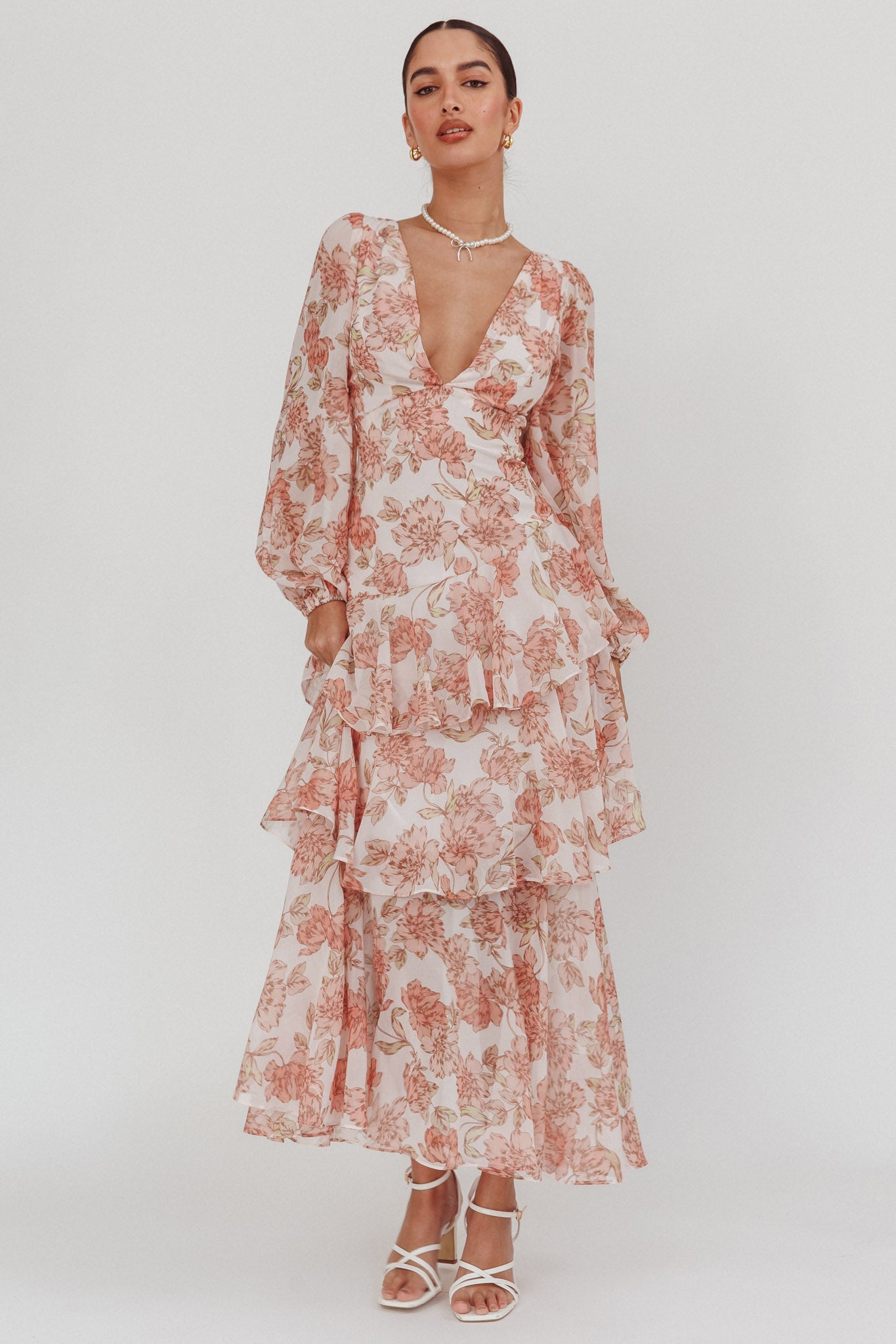 Veda Long Sleeve Floral Tiered Ruffle Maxi Dress Peach