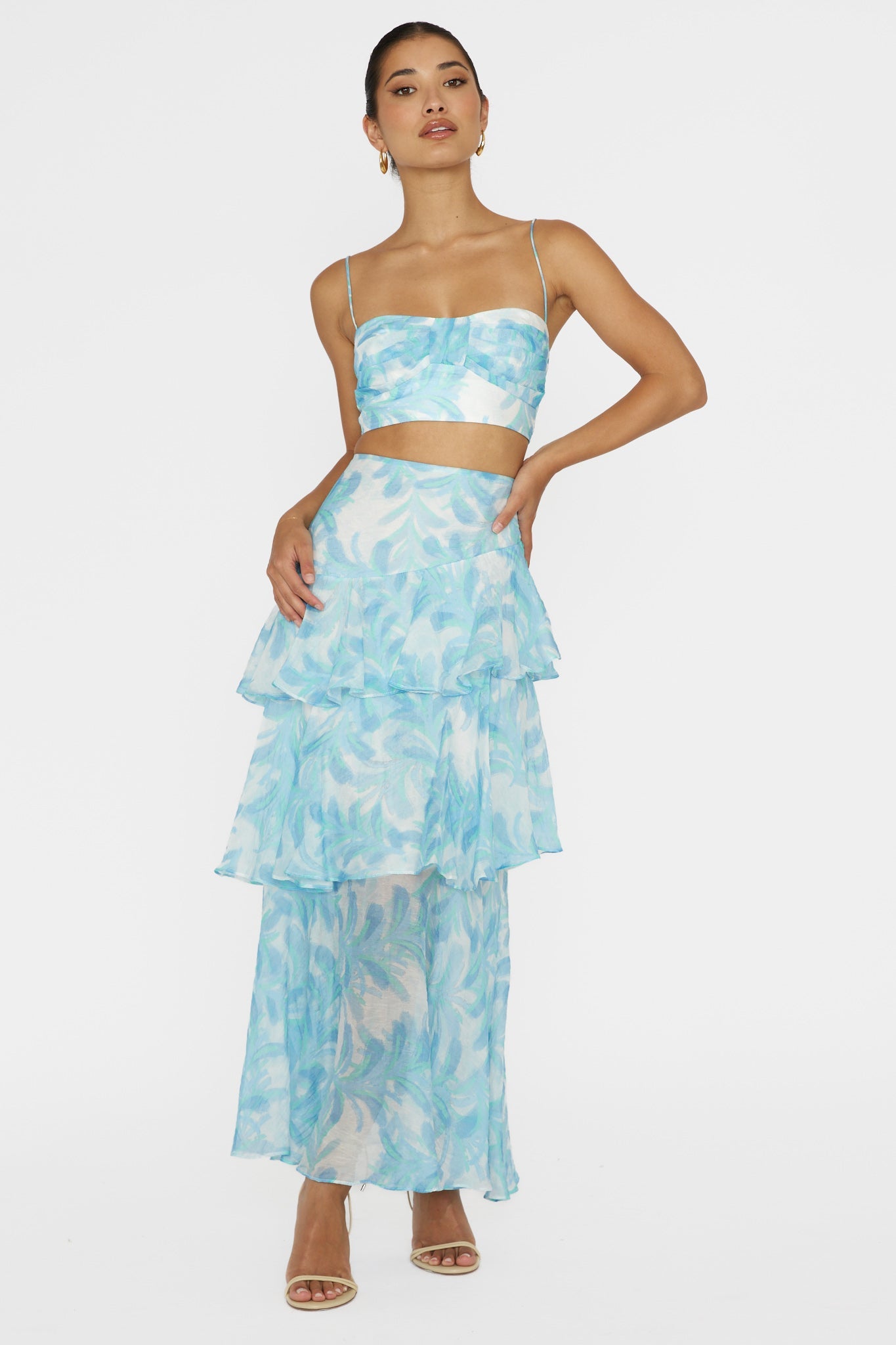 Jaws will drop when you float by in our gorgeous Veda crop top. With its pretty pleat detail and floral print fabric, it's fit for a princess. Team it with its matching skirt and strappy heels for an anniversary dinner or special birthday celebration.
