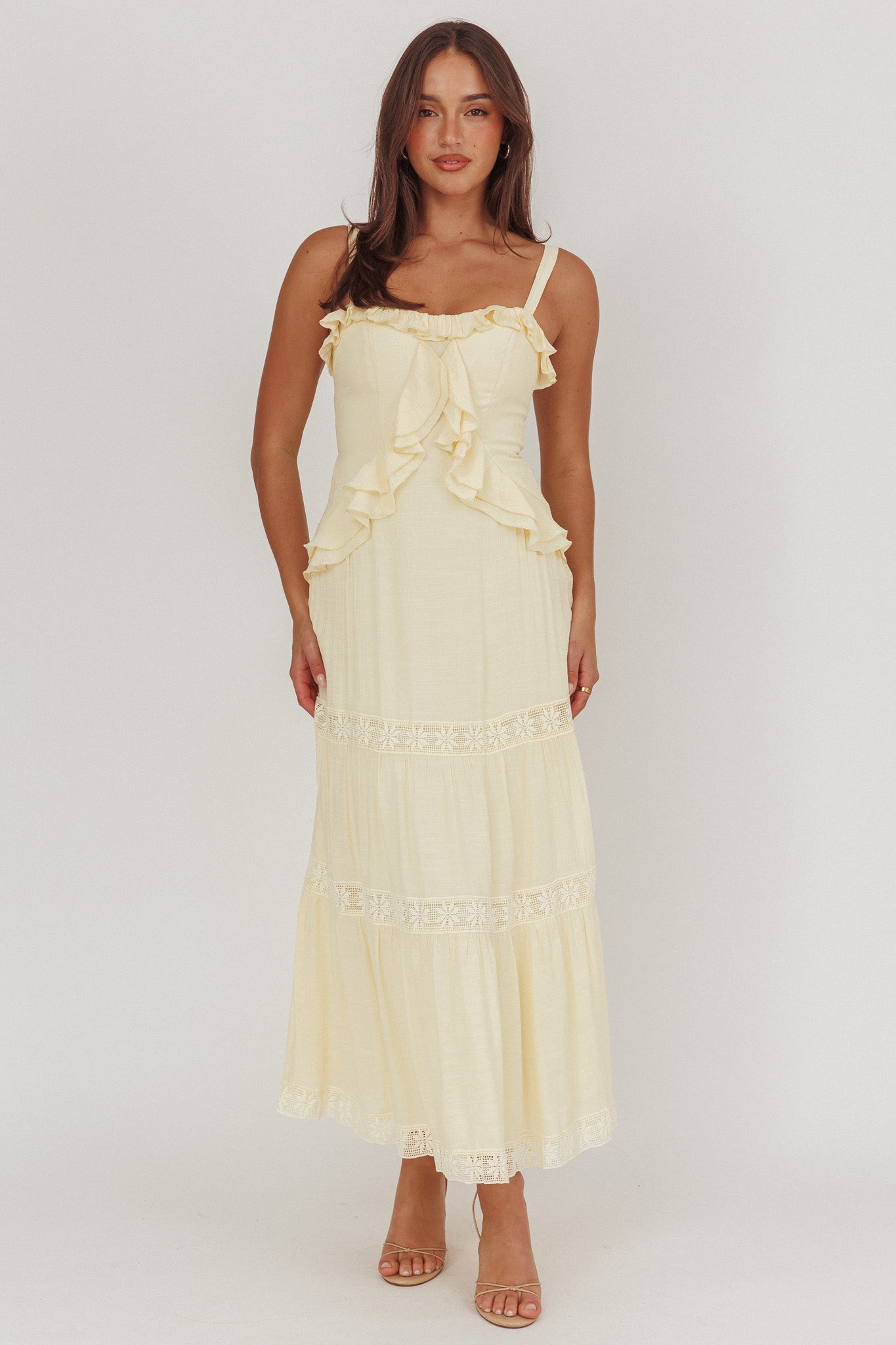Vienna Sky Frill And Crochet Trim Maxi Dress Cream