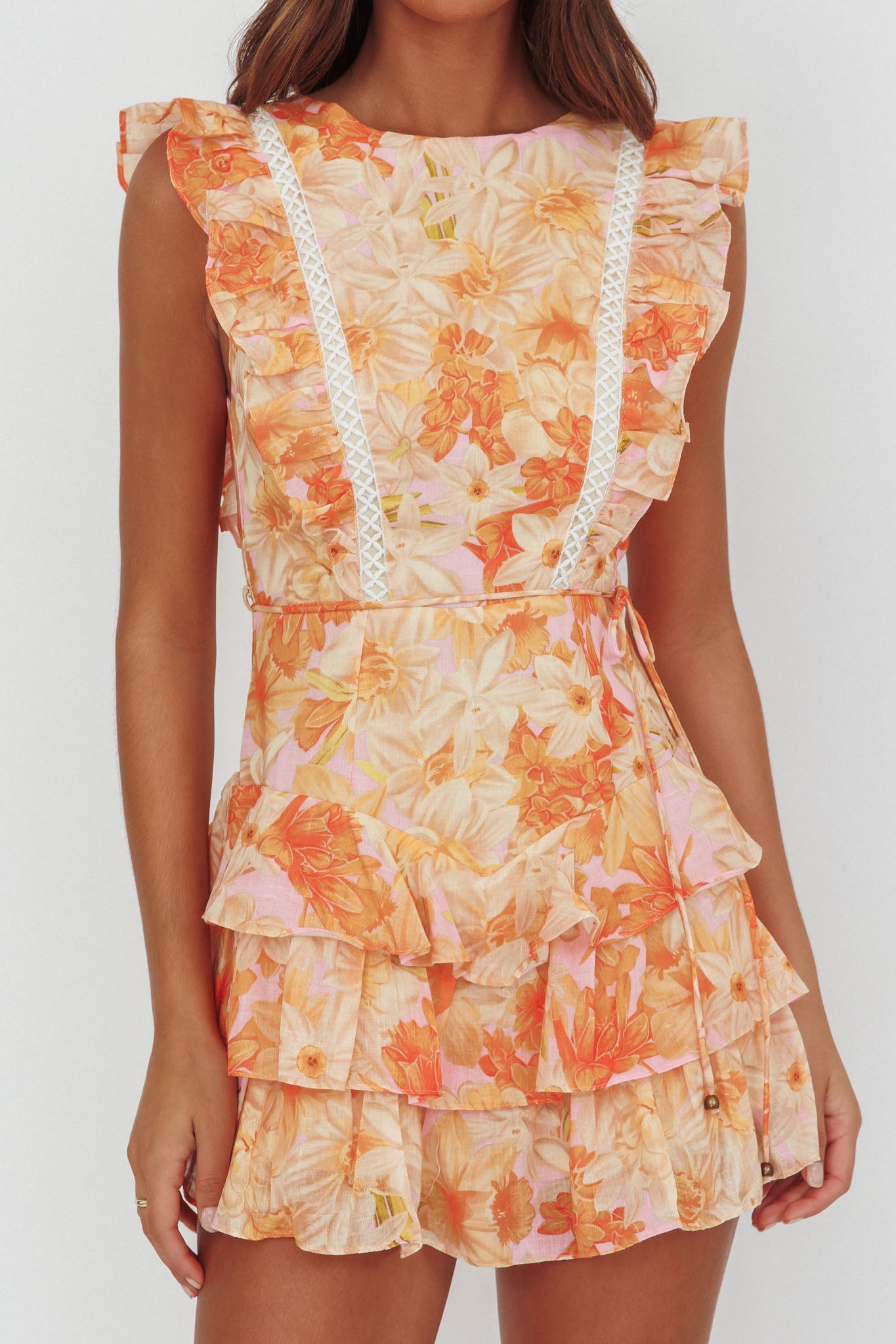 Weekend Muse Sleeveless Layered Frill Romper Flowers Yellow